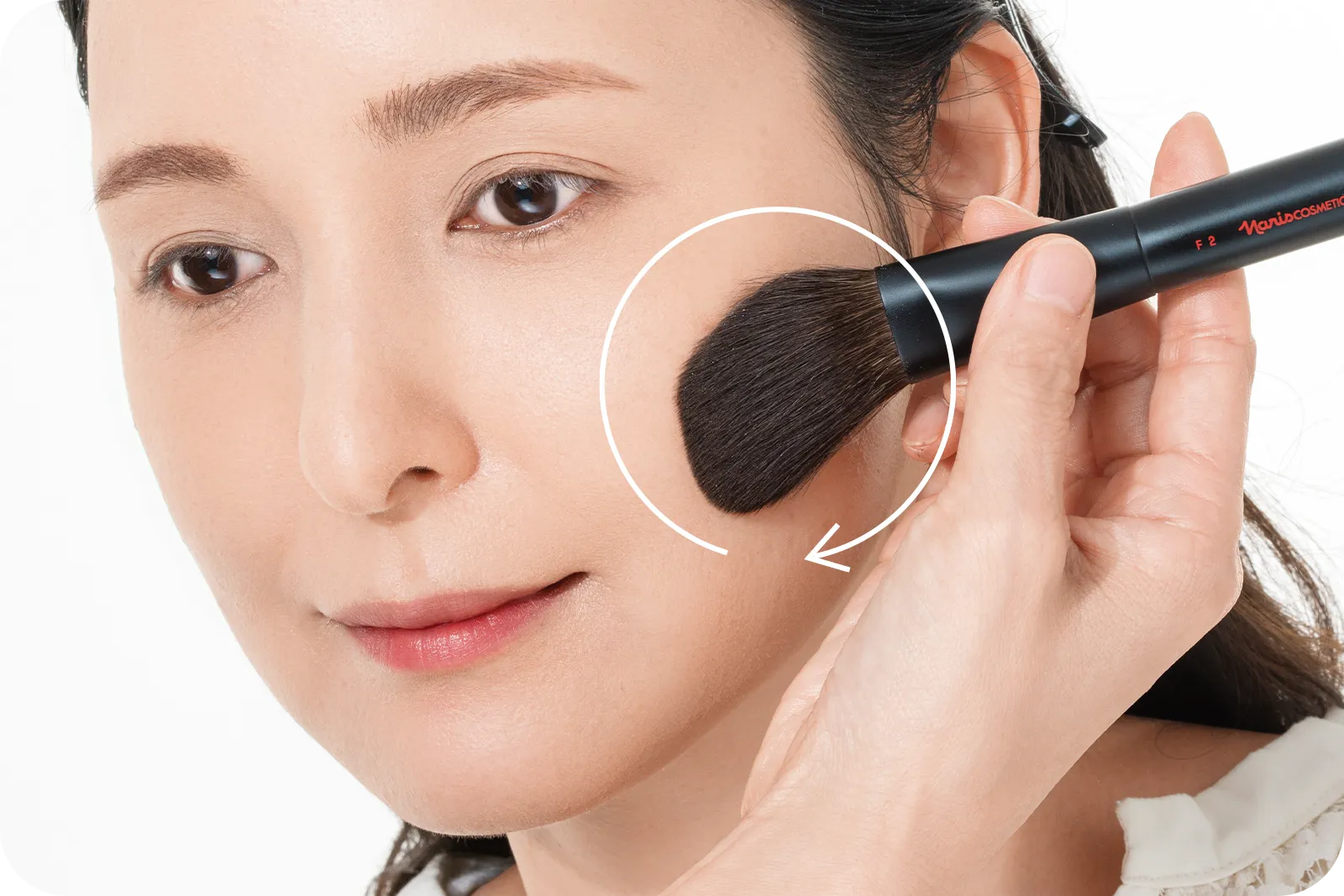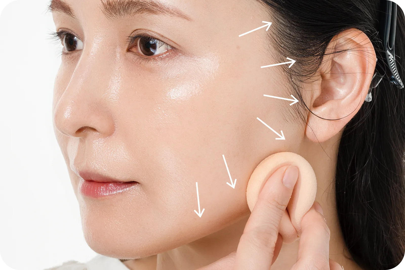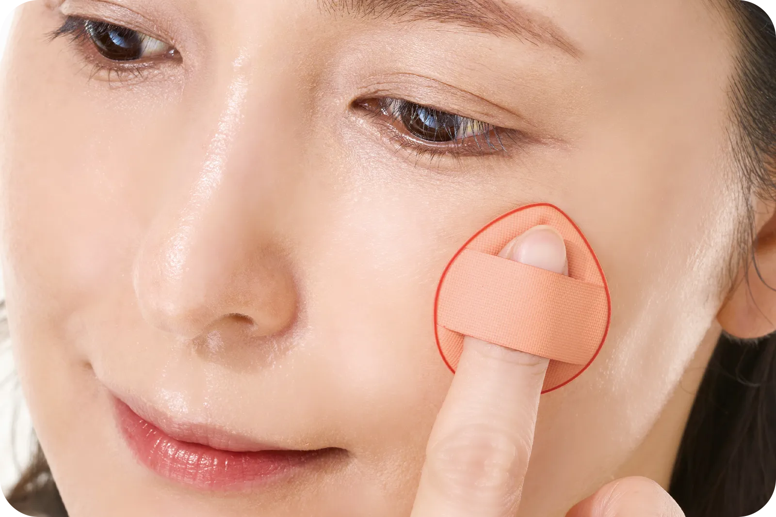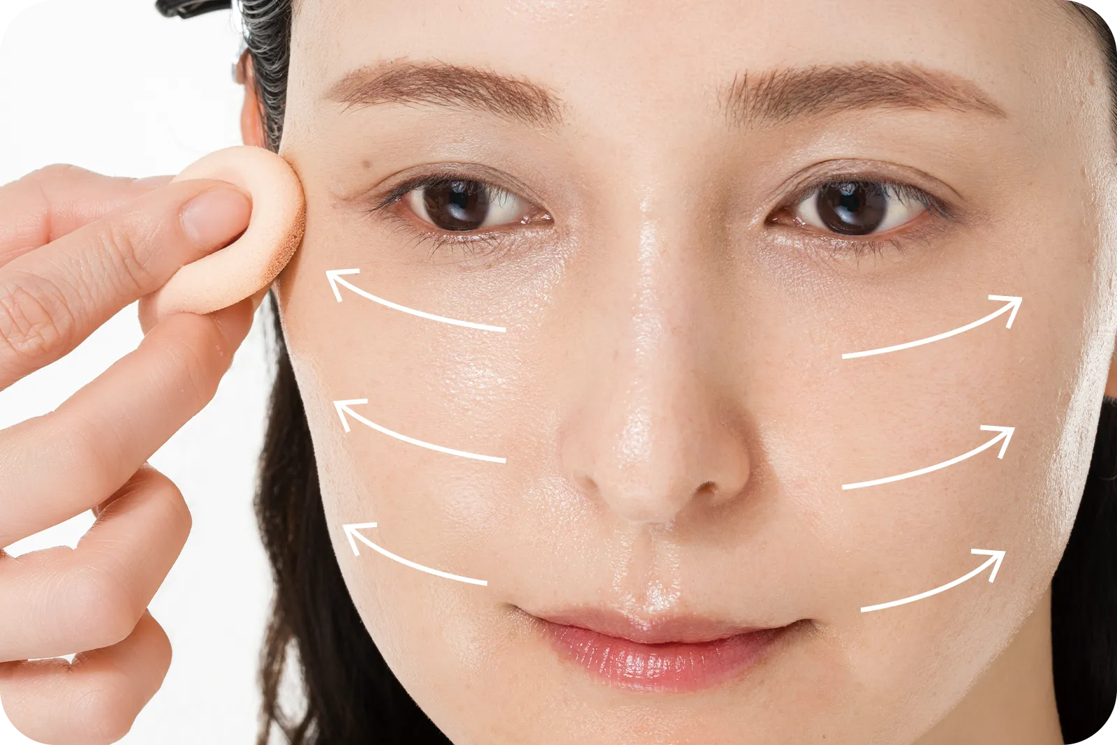 ファンデーションを塗るときに大切なのが、滑らせながら塗ること。肌の上に0.1mmの膜を張るイメージで。決して擦らず、滑らせながらツヤを作りましょう。