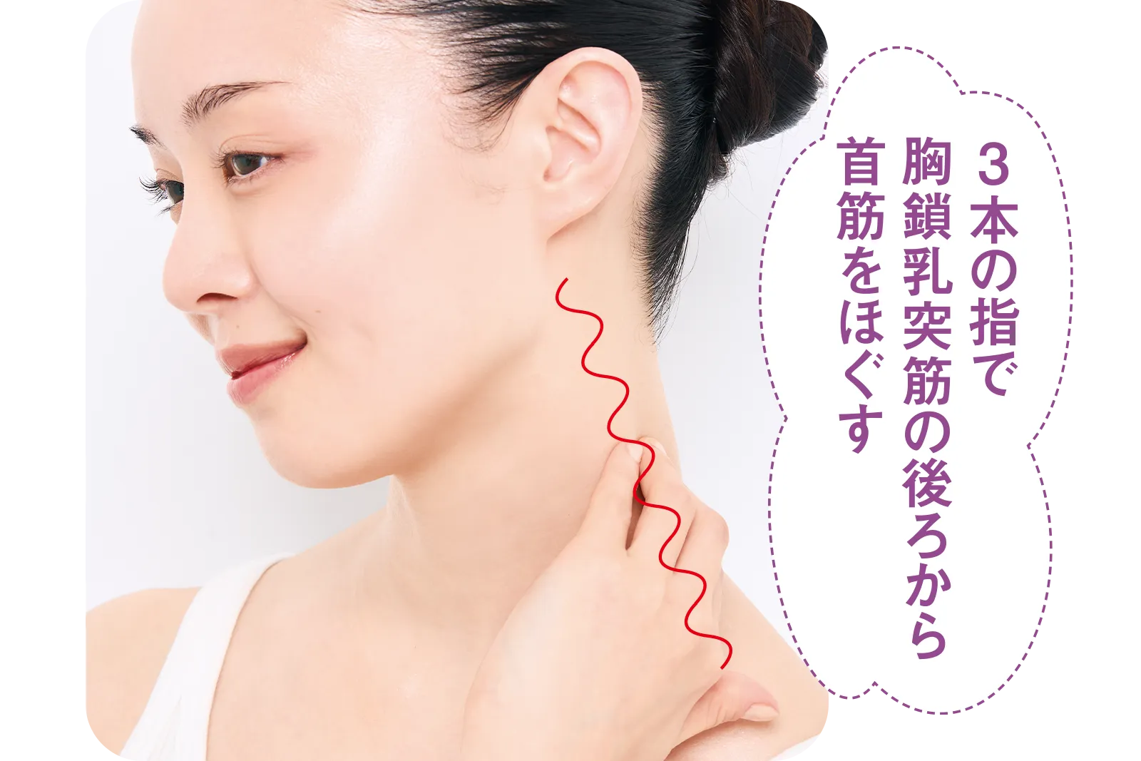 また、耳下腺から鎖骨に向かって縦に伸びる胸鎖乳突筋=別名美人ラインが出ていると、よりフェイスラインが引き締まって見えますよ。