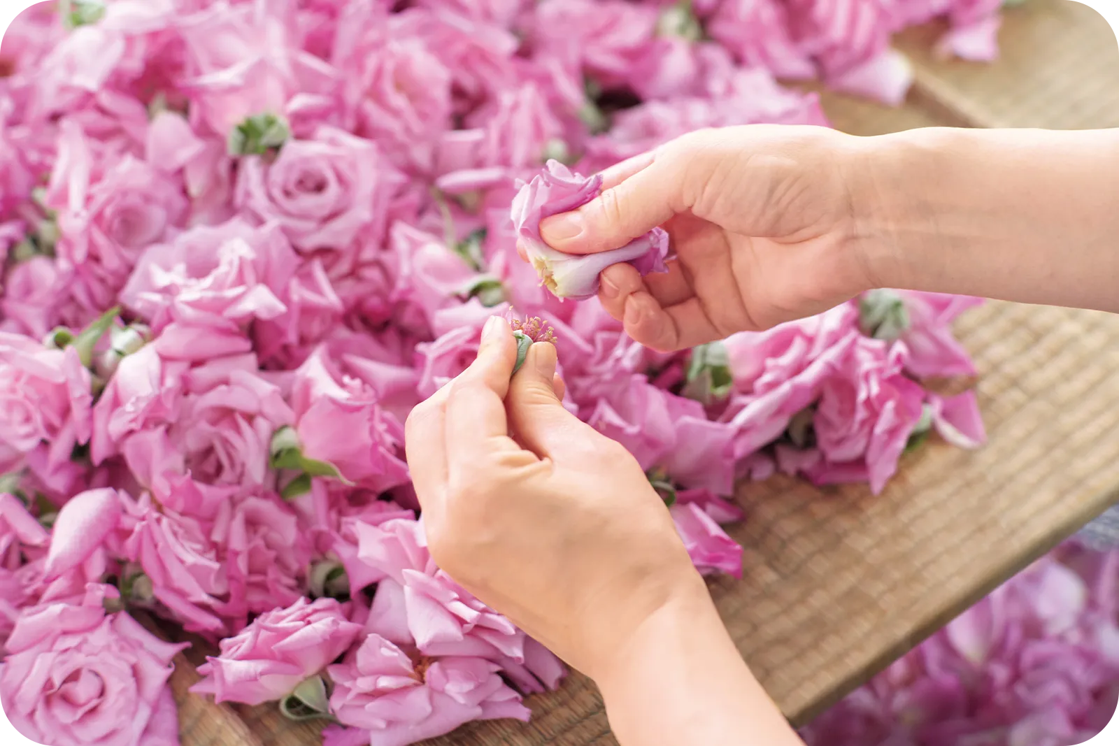 バラは、病害虫の影響を受けやすい繊細な植物です。しかし、「お客様の肌に触れるものとして、どこまでも純粋でありたい」という想いから、ナリス ローズガーデンでは、栽培期間中は農薬を使用しない減農薬栽培を徹底しています。やむを得ず農薬を使う際も、エキスを抽出する花びらには一切かからないよう、細心の注意を払います。それもまた、お客様一人ひとりと真摯に向き合う、私たちのものづくりへの姿勢の表れです。