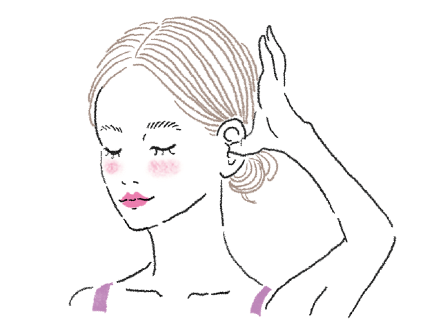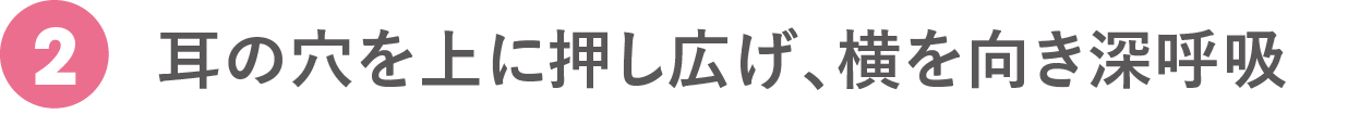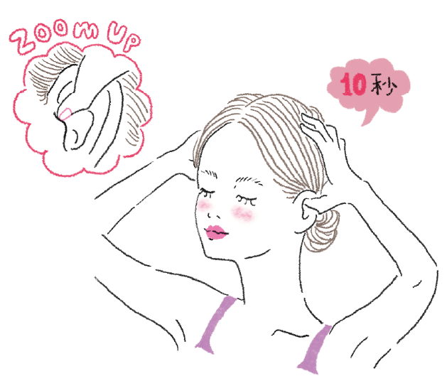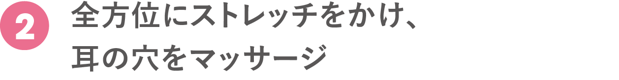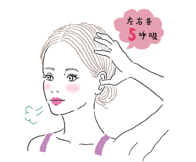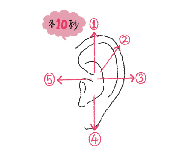 耳の穴に親指を引っ掛けるように入れ、残りの4指は頭を軽くつかむ。息を吐きながら親指を引き上げ、耳の穴を上に広げる。豆腐を崩すくらいのソフトな力加減で、じんわりと10秒。