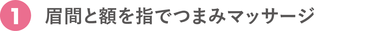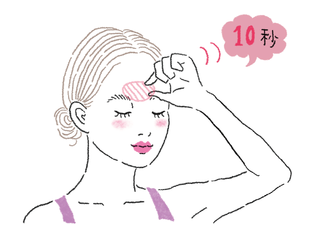 血流が悪く硬くなっている筋肉に刺激を与えてゆるめる。眉間と額の中心を指でつまみ上げ、血流を促して。10秒。