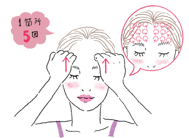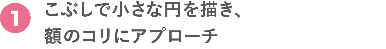 こぶしをつくり、平らな面を額に当てる。皮膚を1cm引き上げ、その状態のままほぐすイメージで筋肉に垂直に圧をかけ、外方向に小さく円を描きながら揉む。位置をずらしながら額全体をマッサージ。1箇所5回。