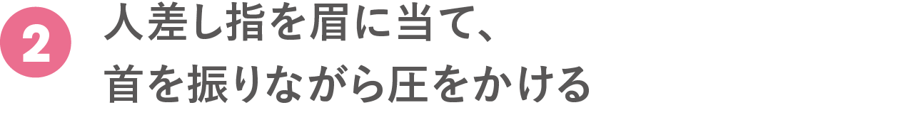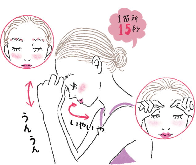 テーブルに両ひじをつき、人差し指をカギ型(人差し指を曲げ、第一関節と第二関節の間の平らな面を使う)にして眉頭に当てる。頭の重みを利用しながら、首を縦に「うん、うん」、横に「いや、いや」と小さく動かす。1箇所15秒。