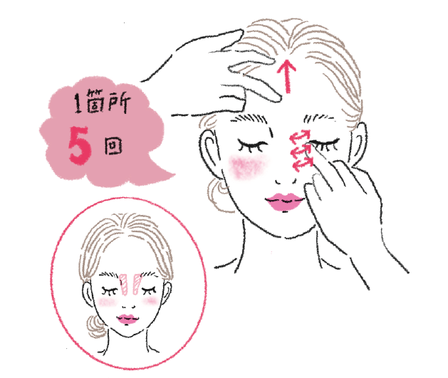 「血管やリンパが集まる額や眉間の筋肉がこると、上まぶたのたるみの原因に繋がります。この部分をピンポイントでマッサージして、弾力を取り戻しましょう!
