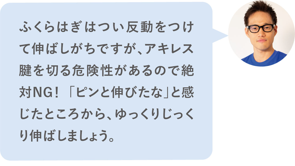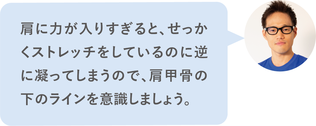 1分間継続してストレッチするのが難しければ、20秒×3セットなど分けてもOK。無理すると力んでしまってきちんと伸びないので、頑張らないことがポイントです。