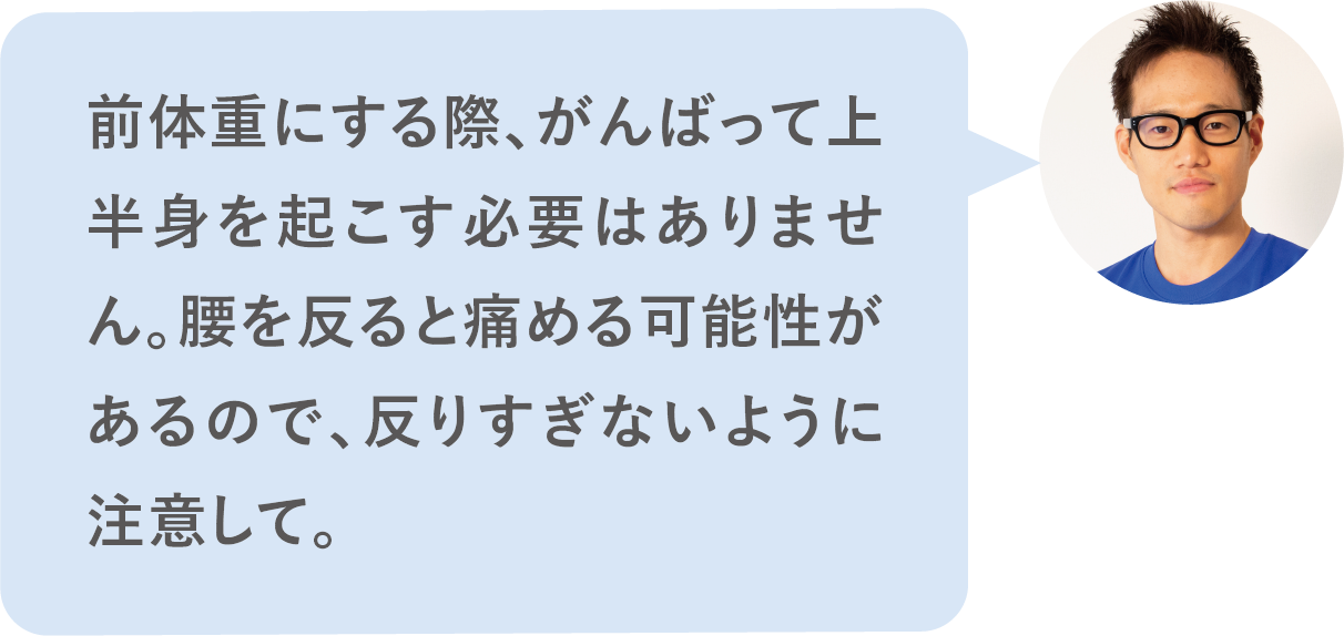 後ろの膝を地面につけて伸ばし、前の膝はおおよそ90度に立てる。手は両方とも前につき、バランスを取りながら前方方向に体重をかけてキープする。これを片足1分ずつ行う。