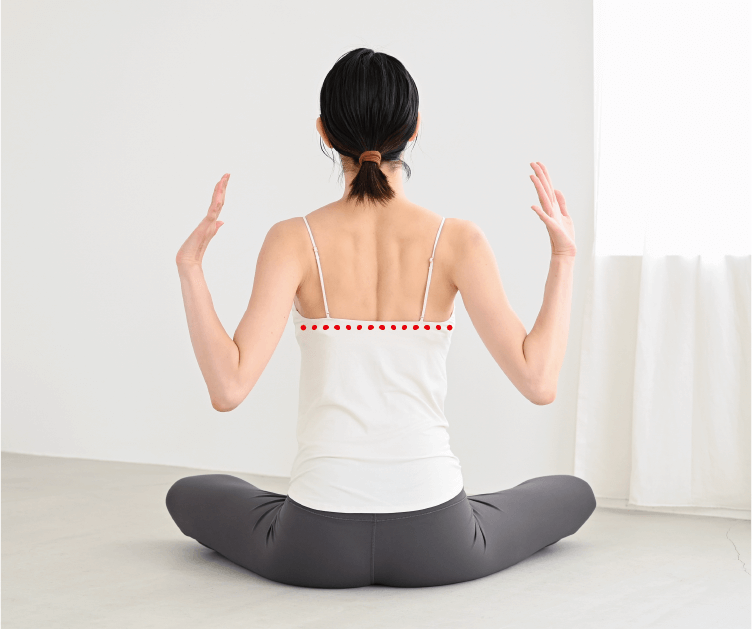 肩甲骨の下のラインを意識して、肘をゆっくりと寄せていく。これを30秒行う(※手の平の向きは写真と反対でも、やりやすい方でOK)。