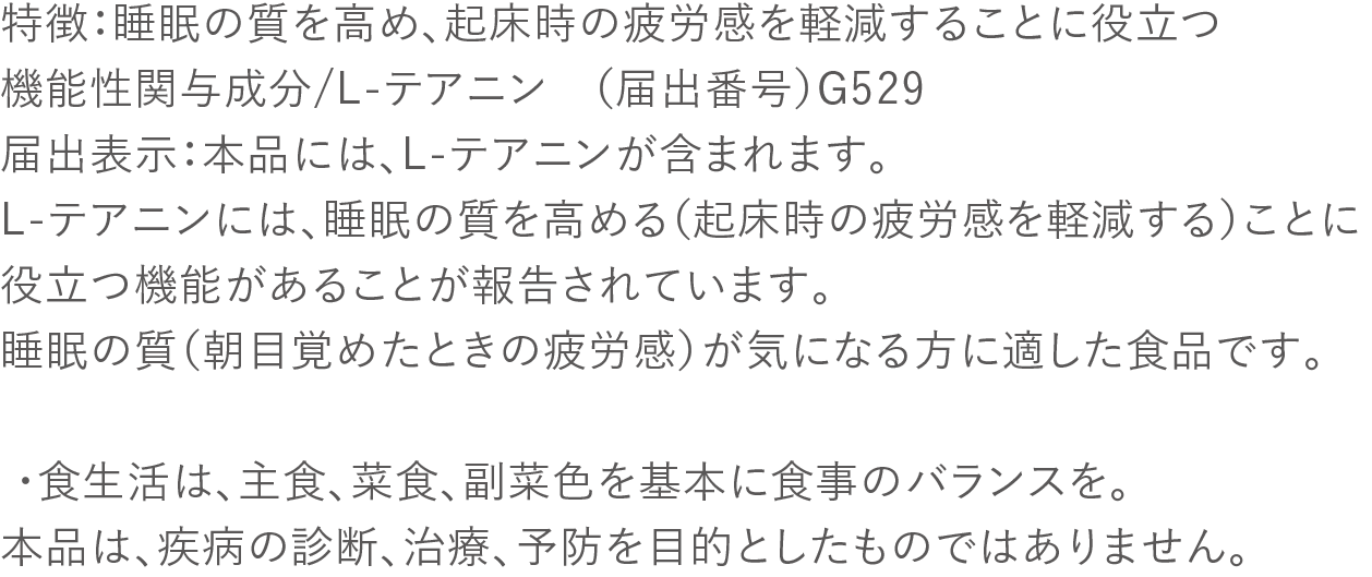 価格:¥4,104(税込)カフェインレスで、ルイボスフレーバーの個包装のお茶なので、いつでもどこでも気軽に摂取しながら、睡眠の質をあげ、起床後の疲労感を軽減することに役立ちます。自宅でも外出先でも、マイボトルでも。ホットでもアイスでも飲むことができます。