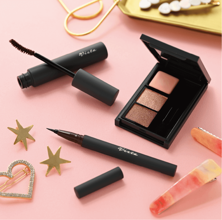 1月8日は語呂合わせで、「いちばんハッピーな日」! そんなハッピーな日をより楽しく過ごすために、今日はいつもよりテンションが上がるコスメを選んでメイクをしては? 私は、大好きなピンクカラーの「Vieta グロウフィット アイズ (ピンクブラウン)」のアイシャドウを主役にしたアイメイクにします。アイシャドウに合わせて、ピンクとの相性バッチリで、優しい印象も与えてくれるブラウンの「Vieta エレガントラッシュ セパレート マスカラ」と「Vieta スタイリングフレーム リキッドアイライナー」をチョイスしました。自分が好きなカラーを主役にしたアイメイクで、ハッピーな1日を過ごしてみて。