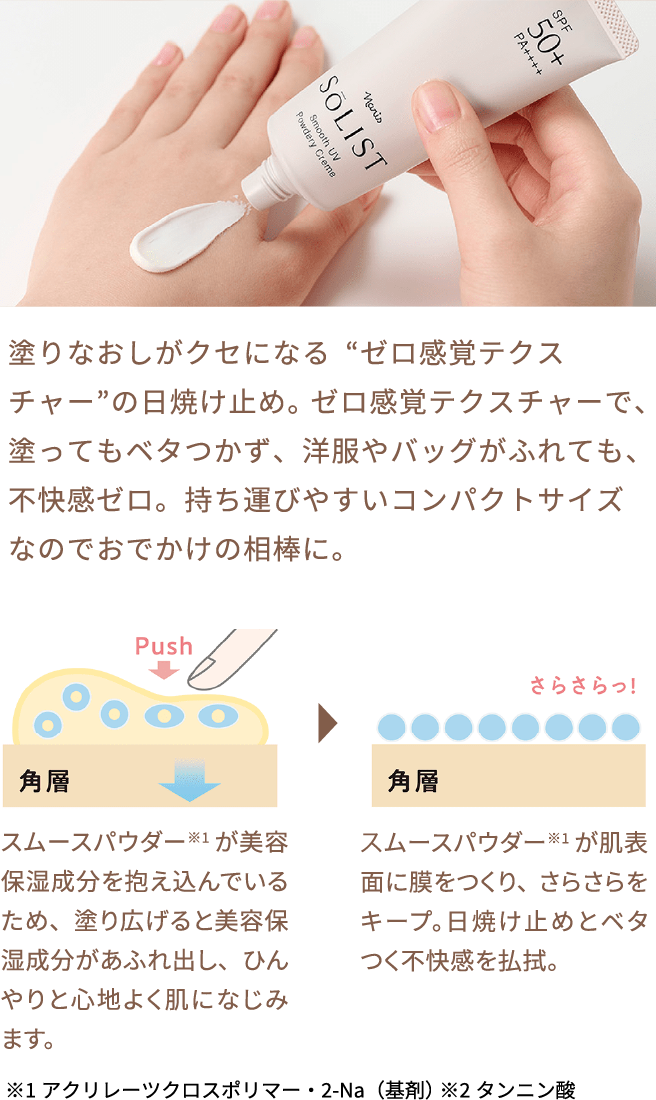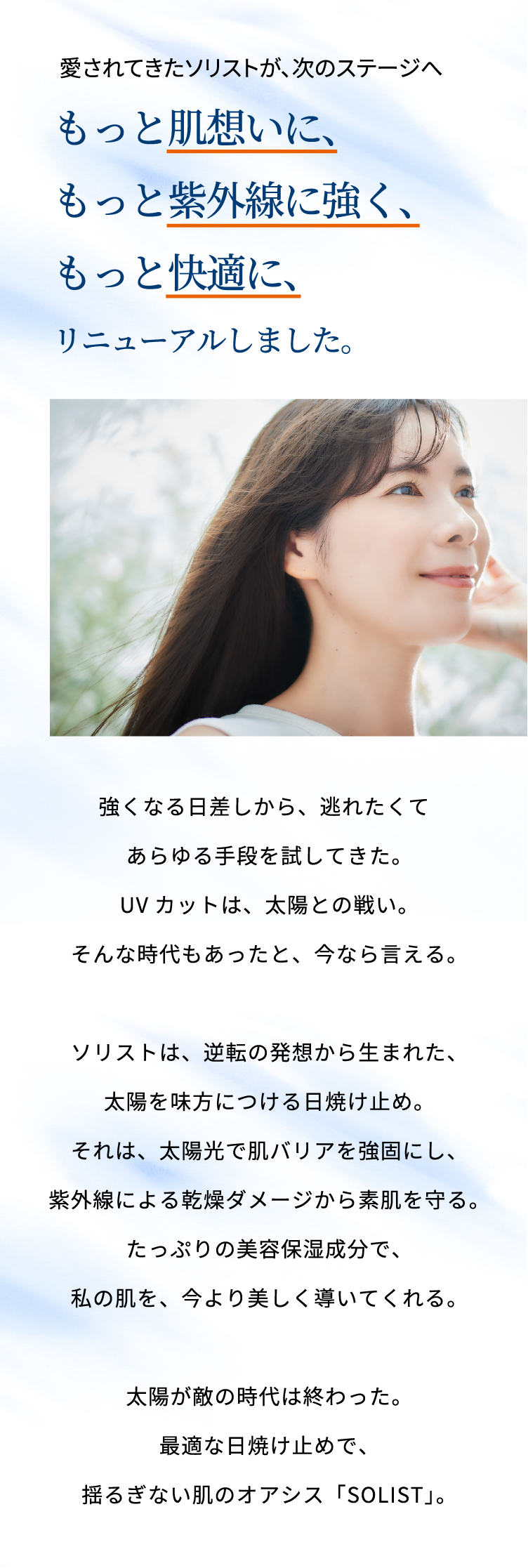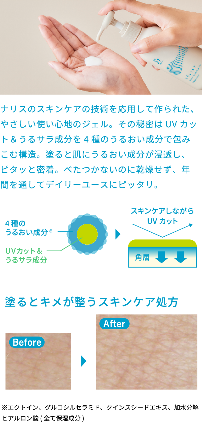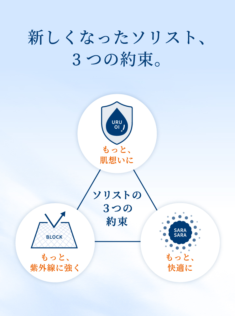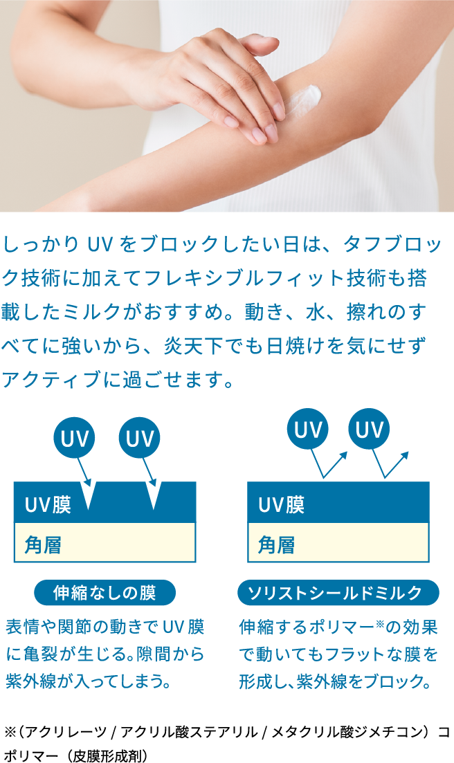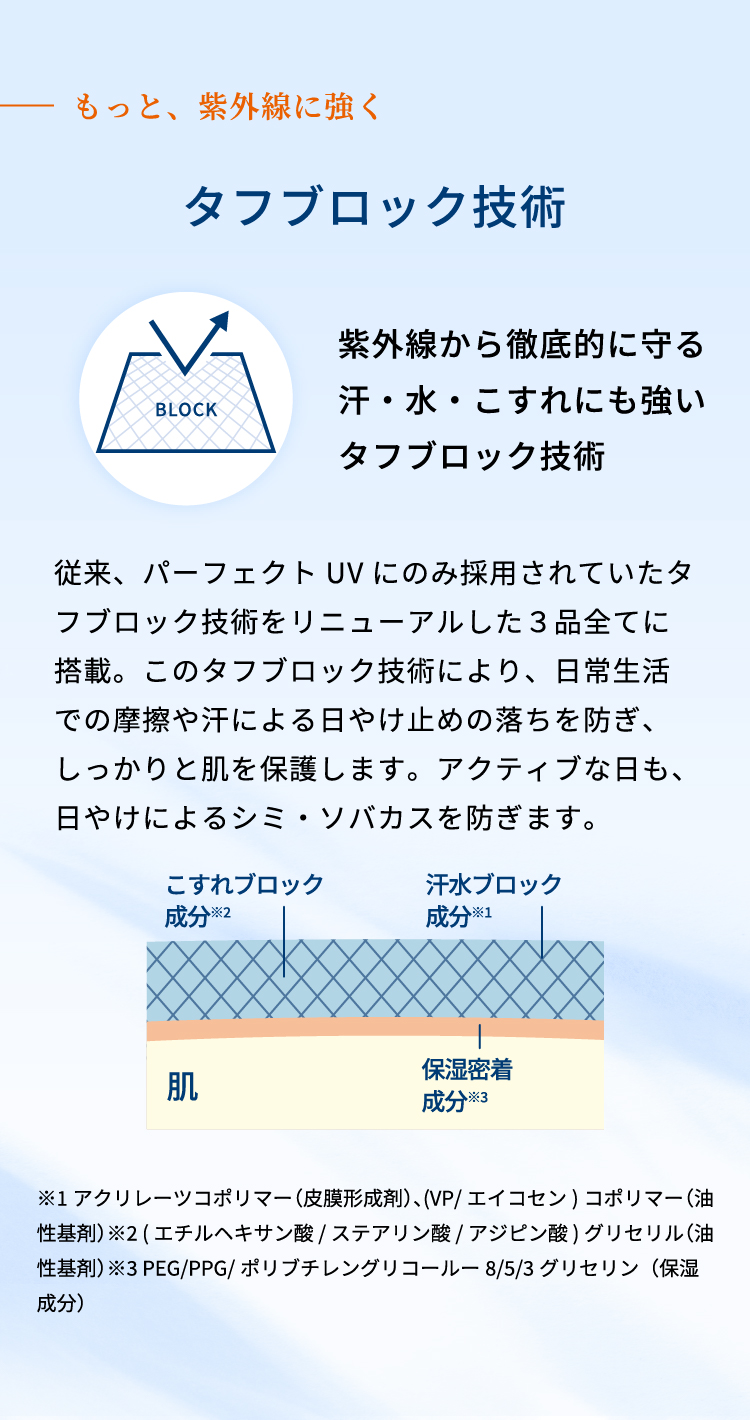 今回のリニューアルで、具体的にどこが変わったのですか?最大のポイントは共通成分である高機能保湿成分「エクトイン」の配合です。また、従来、パーフェクトUVシルキーミルクのみに処方されていたタフブロック技術をリニューアルした3品全てに搭載しました。専用のクレンジングは必要ですか?石けんやボディソープで落とせますか?洗顔料やボディソープで落とせるので、専用のクレンジングは不要です。子供と一緒に使えますか?2歳以上のお子さまから、ご家族でお使いいただけます。お子様がご使用の際は保護者の方がご様子を見ながらお使いくださるようお願いいたします。 -